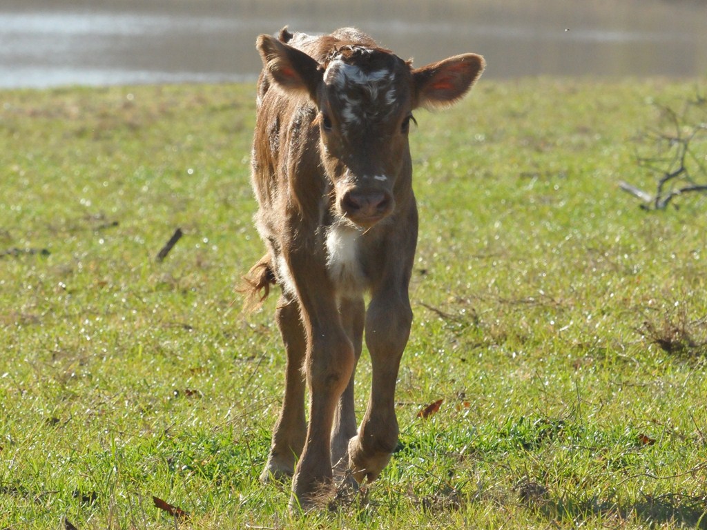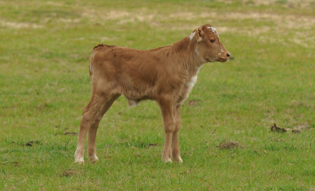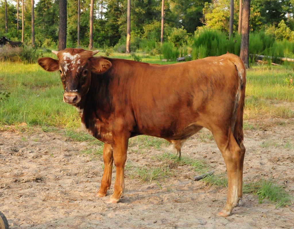 Brindle with white specs on face. Nice disposition; takes cubes from hand. Charming young steer, in process of being halter-broken.